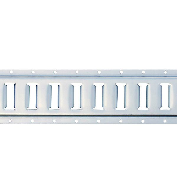 - Track Dimensions: Width: 5in, Height: 0.5in, Length: 48in, Diameter of Mounting Holes: 0.75in, Material: 12 Gauge Steel, Finish: Zinc plated