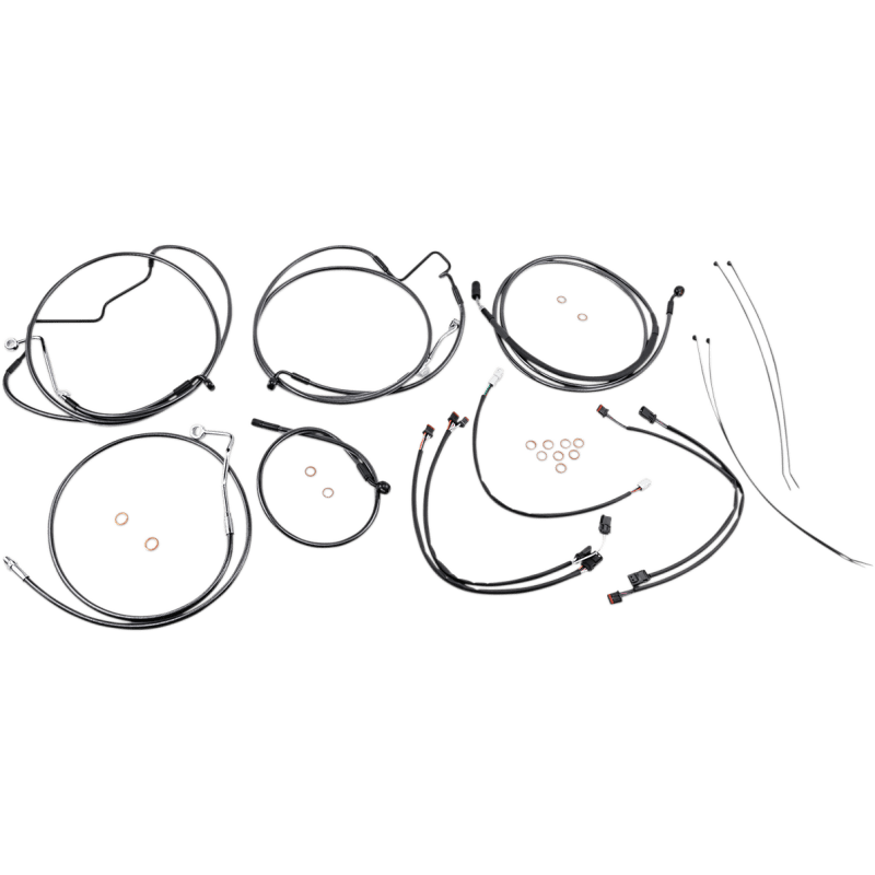 Kit includes throttle and idle cables of throttle-by-wire extensions, clutch cable or hydraulic clutch line, brake lines, copper crush washers, hardware, and any necessary switch wiring of turn signal extension
