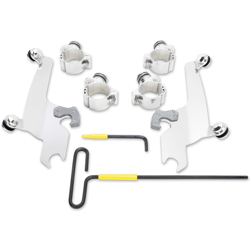 Kits are a combination of CNC-machined aluminum plates and anchors, stainless steel hardware, gray polymer bushings and glass-filled nylon latches or "Night Shades" black version which, is a gradient black windshield with black E-coated stainless steel straps, fittings and hardware for a black-on-black sinister look
