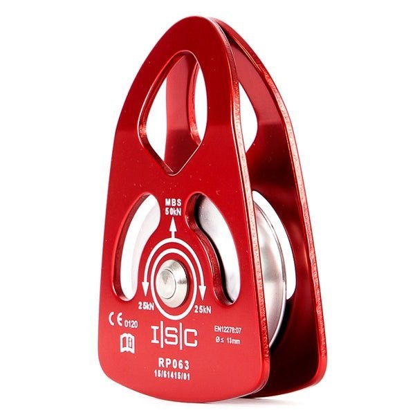 The swing-side aluminium has plates that swing open to install rope. Particularly useful for use when doubling the line, the rope cannot accidentally come out of the block. Use the steel locking carabiners or shackles to anchor to a polyester sling. The 63 mm (2-1/2'') diameter aluminium pulley is mounted on self-lubricating bushing and stainless steel axle. The swing sides are also made of anodized aluminium.